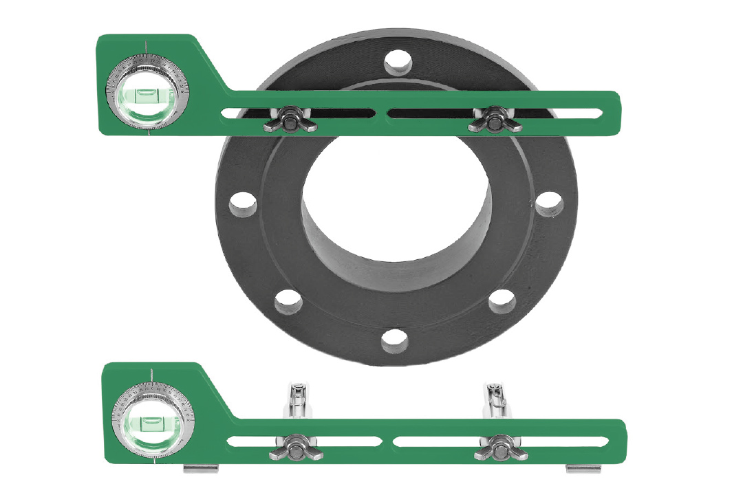 Mit verstellbarer Winkelmesserlibelle und verschiebbaren Passbolzen. Die Passbolzen passen in Flanschlöcher für alle gängigen Durchmesser, wodurch die anzuschweißenden Flanschen genau ausgerichtet werden. Winkel und Neigung sind ohne umzurechnen leicht einstell- und ablesbar.