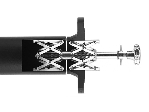 Der untere Spreizkörper wird im Rohrbogen so weit gespannt, dass die Vorderkanten des oberen Spreizkörpers an der Stirnseite des Rohrbogens anliegen. Die Anlageschienen sind auf Wunsch aus Edelstahl lieferbar.